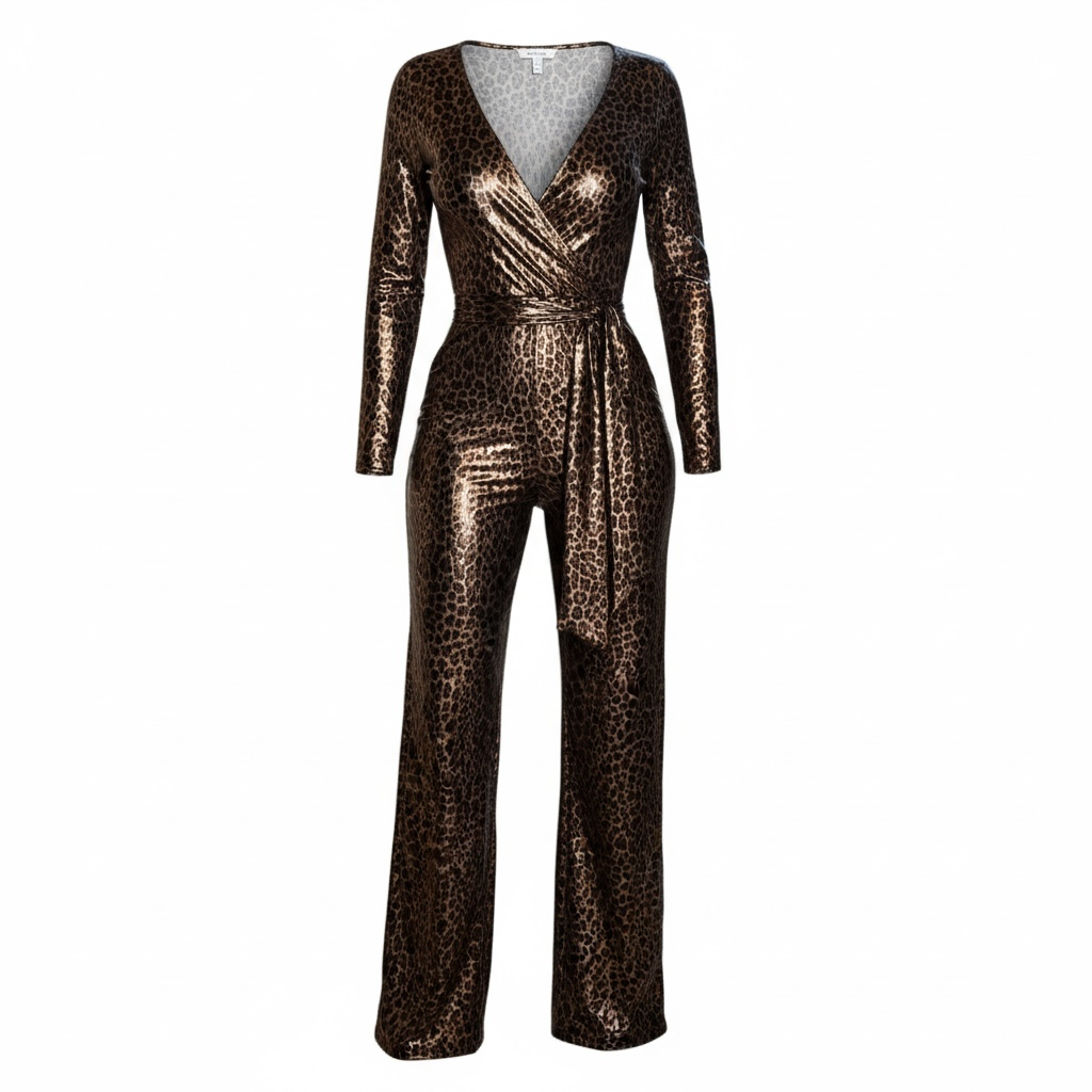 Unleash your bold side in this daring animal print jumpsuit designed to turn heads. Featuring a plunging neckline and stretchy fabric that moves with you, this statement piece offers all-day comfort without compromising on style. The removable waistbelt lets you customize your silhouette, while the back zipper ensures an effortless fit. Pair with gold accessories and metallic heels to amplify the attitude. Model pictured wears size small.